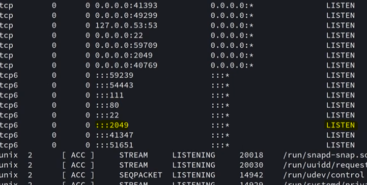 Once again, I go through the motions of checking Sudo privs, unique SUID bits set, and any out of ordinary files/binaries in hopes to escalate privileges. Displaying the services on the host showed that port 2049 was listening, which is the default for NFS.