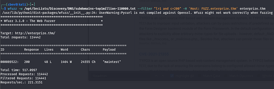 I expand my search while digging for subdomains, eventually finding a valid one at maintest.enterprize.thm.