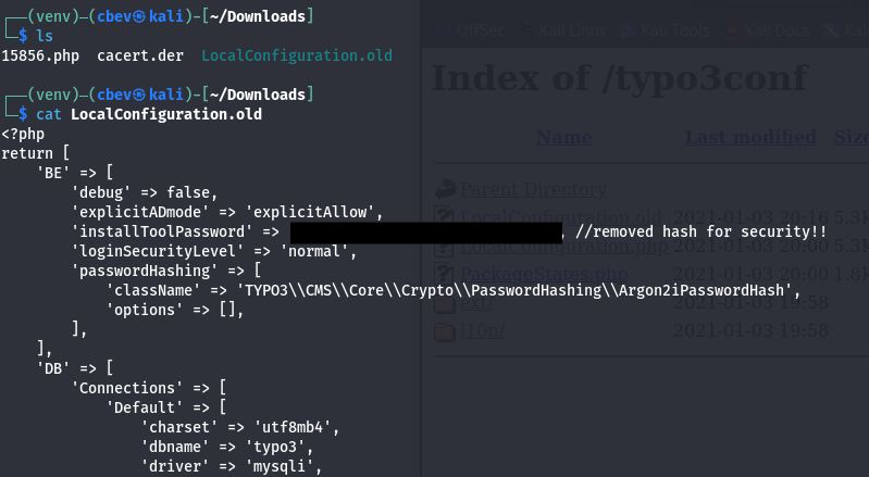 Gobuster shows a few interesting directories as well. The /typo3conf one contains a LocalConfiguration.old file which conveniently has a line with the old password and a SYS encryption key.