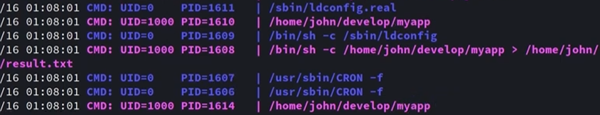 I’m thinking that something must be running myapp in the background as this seems to be the only attack vector. I snoop on all running processes by uploading pspy64 to /tmp and find that a cronjob must be executing myapp and saving it to result.txt. Judging by the UID, this is John running it.
