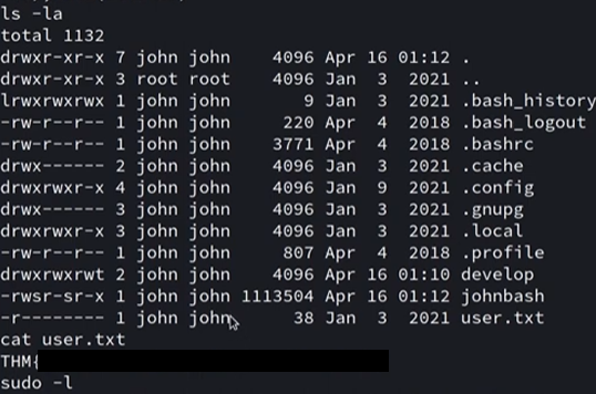 All that’s left to do is wait for the cronjob to execute and enjoy our shell as John. Let’s grab the first flag while we’re here, I think it’s definitely well earned.