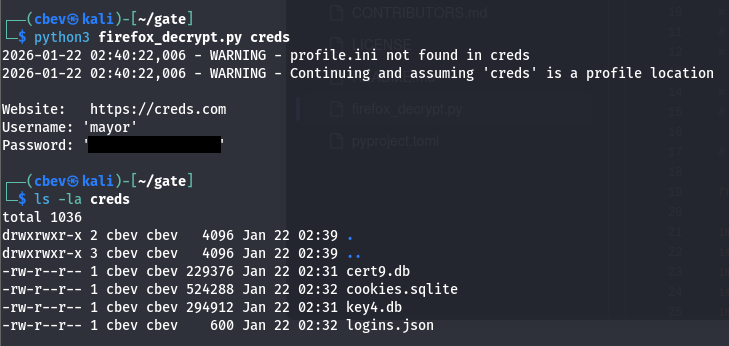 This shows a few potential sensitive files stored regarding Firefox which is non-standard on Windows machines. I copy these back over to my local machine using the SMB share as a gateway and try to extract credentials from any of them.