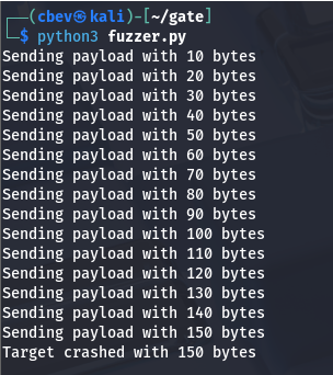 print("Fuzzing crashed at {} bytes".format(len(string) - len(prefix)))