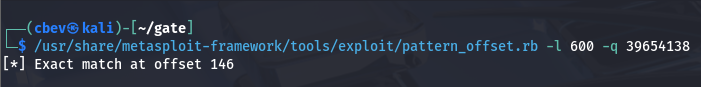 After sending the pattern_offset payload to the .exe and checking the registers again, I find that the EIP is overwritten with 39654138. We can use Metasploit’s pattern_offset.rb to calculate our requirements.