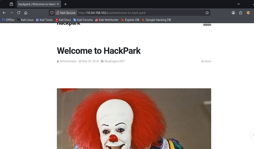 Looks like a windows machine with a web server and somewhere to logon. Checking the landing page shows a blog with the main picture of pennywise the clown.