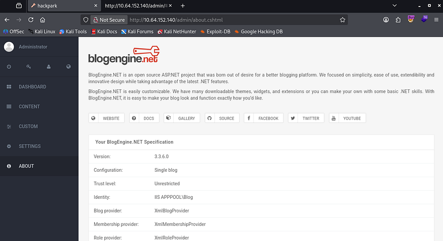 My first thoughts were to change a template page’s source code to be a reverse shell and navigate to it, but the themes seemed premade and didn’t allow for raw code to be replaced. A bit more looking around disclosed the site’s engine and version.
