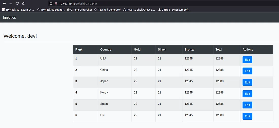 I should note that we need to change the username in Burp Suite to our payload instead of entering it through the site directly as this bypasses the script that blocks keywords. This logs us in as dev instead of admin (probably because it’s the normal login but we found a bypass).