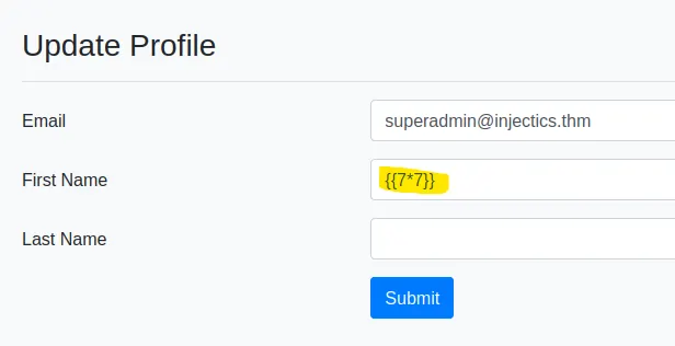 This one reflects that server side template injection is indeed possible via the First Name field.