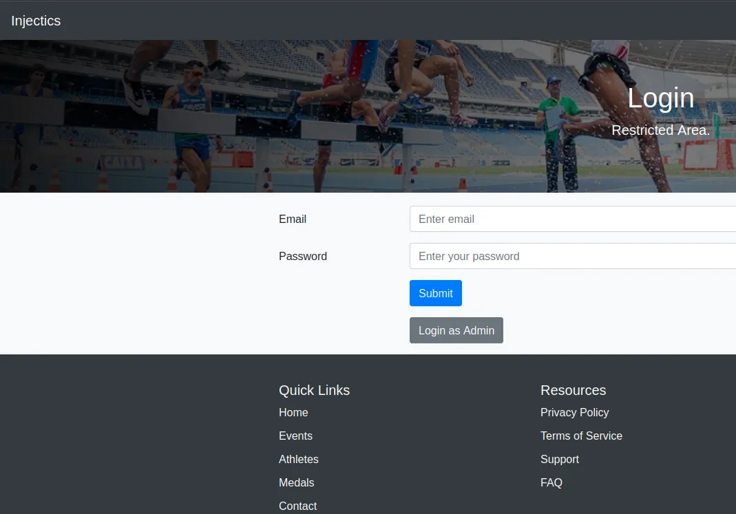 Looking at the login panel for normal users shows a button to login as Admin here as well. This points toward a page at /adminLogin007.php , either way we need an email for the first field as Admin doesn’t work.