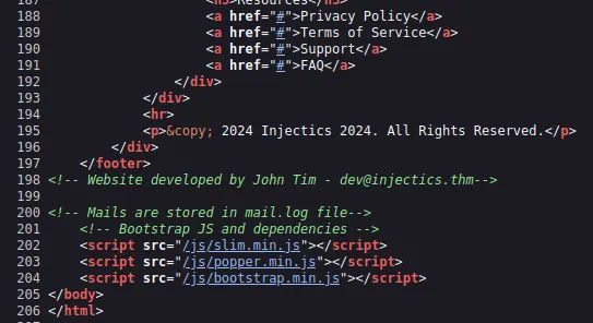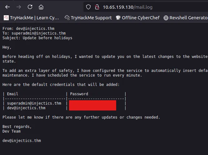 Another comment under it says that all Mails are stored in mail.log . Checking this file location gives us passwords for both dev@injectics.thm and a superadmin account however these passwords only get added as a default to the users table in case of the database being corrupted/deleted.