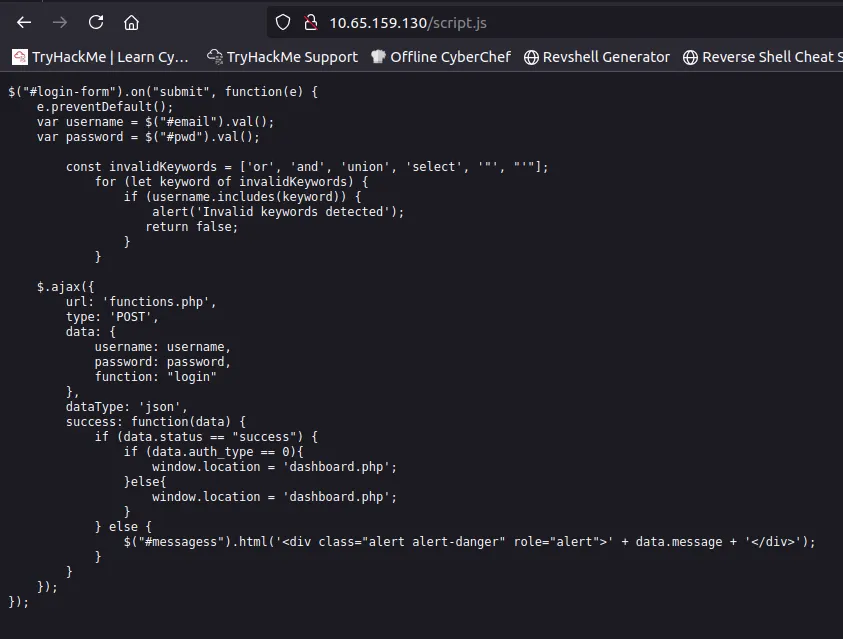 My endpoints scans are now done and I find a script.js file which discloses the logic behind our login request. It sets the following characters/words as invalid input: ‘, “, union, select, or, and.