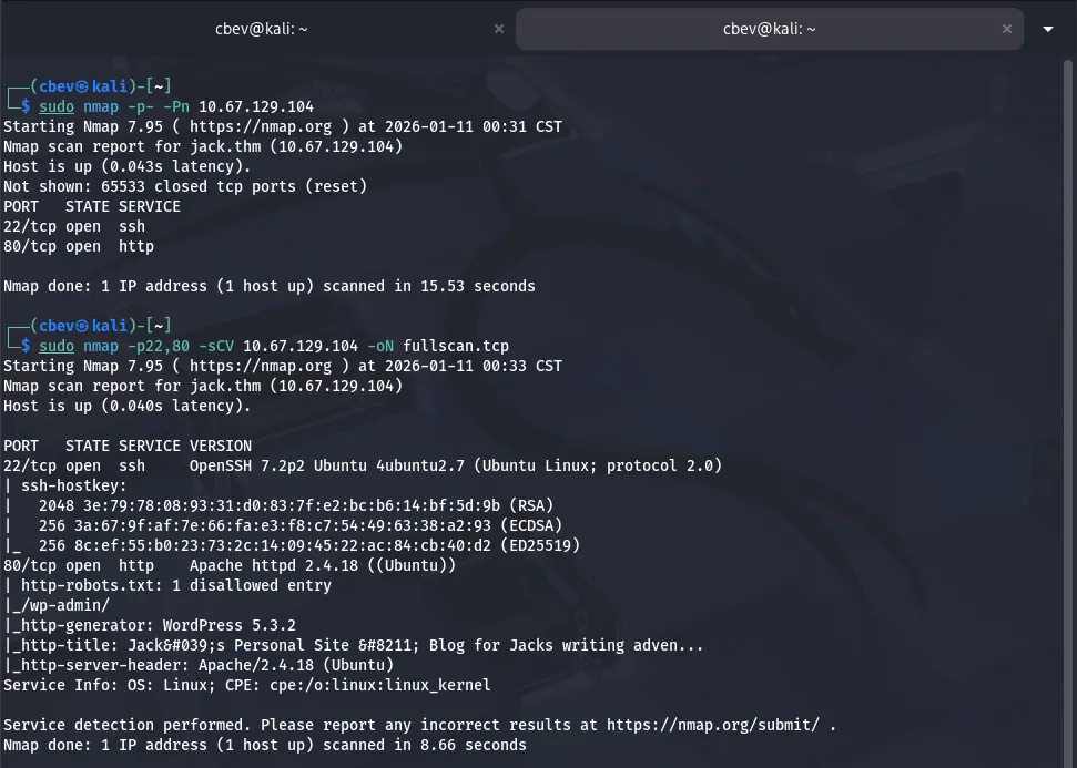 After adding jack.thm to my /etc/hosts file, I start with an Nmap scan on the given IP to find running services.