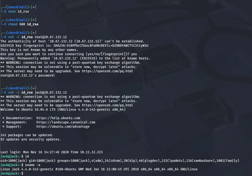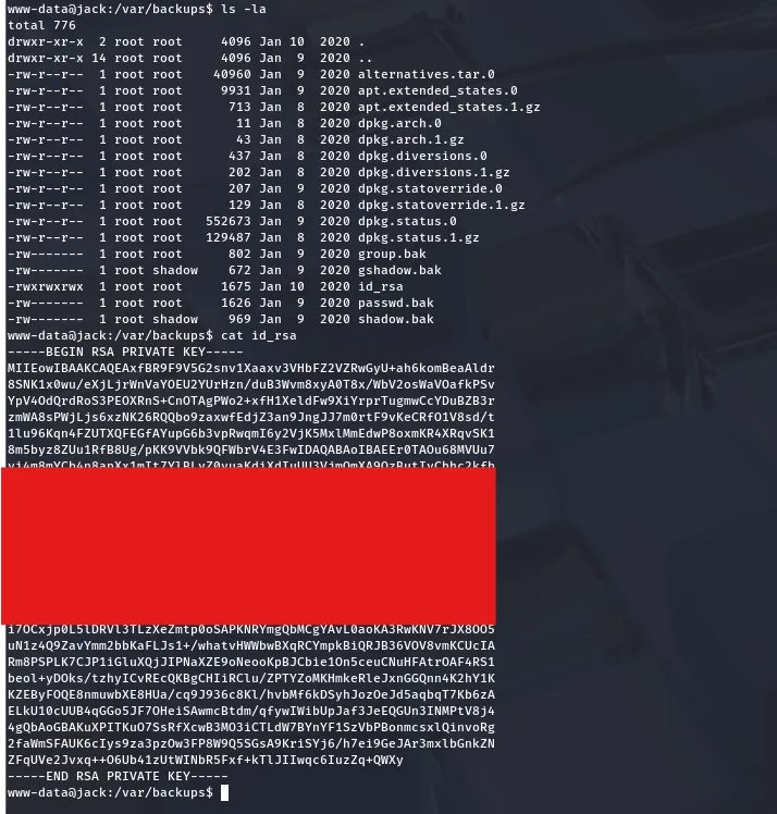 I find an id_rsa key hidden in the /var/backups directory. Now we can SSH onto the box and have a proper shell. I try different usernames until getting a successful attempt with as Jack.