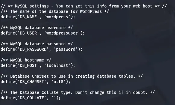 At this point I go about the usual routes for root privesc by checking for SUID/SGID bits set, sudo privileges, and don’t find much. Swapping back to the lower level shell to read what’s in /var/www , I read the wp-config.php file and find the MySQL username and password.