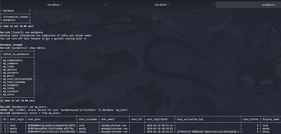 I use this to dump the database on Jack’s SSH shell and find hashes for all three users. Only Jack is a user on the box so I crack his.