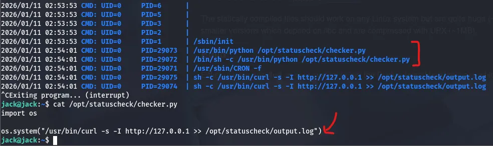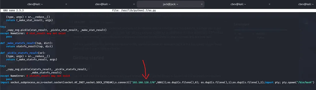 It looks like Jack is apart of the family group which has the ability to write to the os module for python version 2.7 . This means we can add a line containing our reverse shell at the end and wait for the cronjob to execute it.