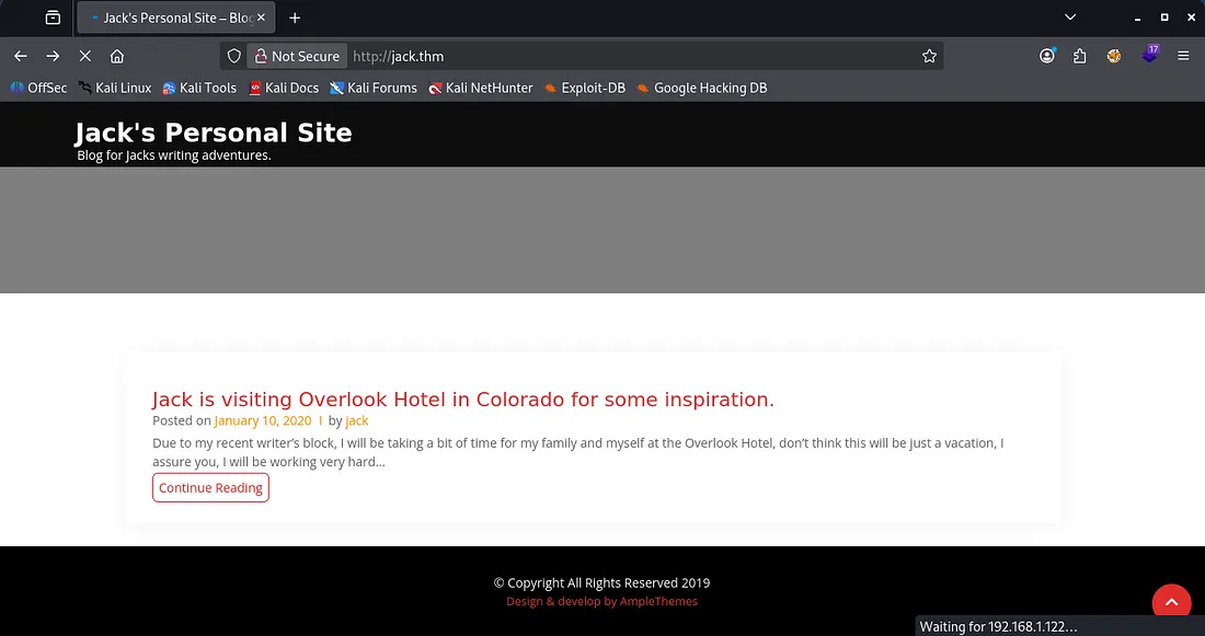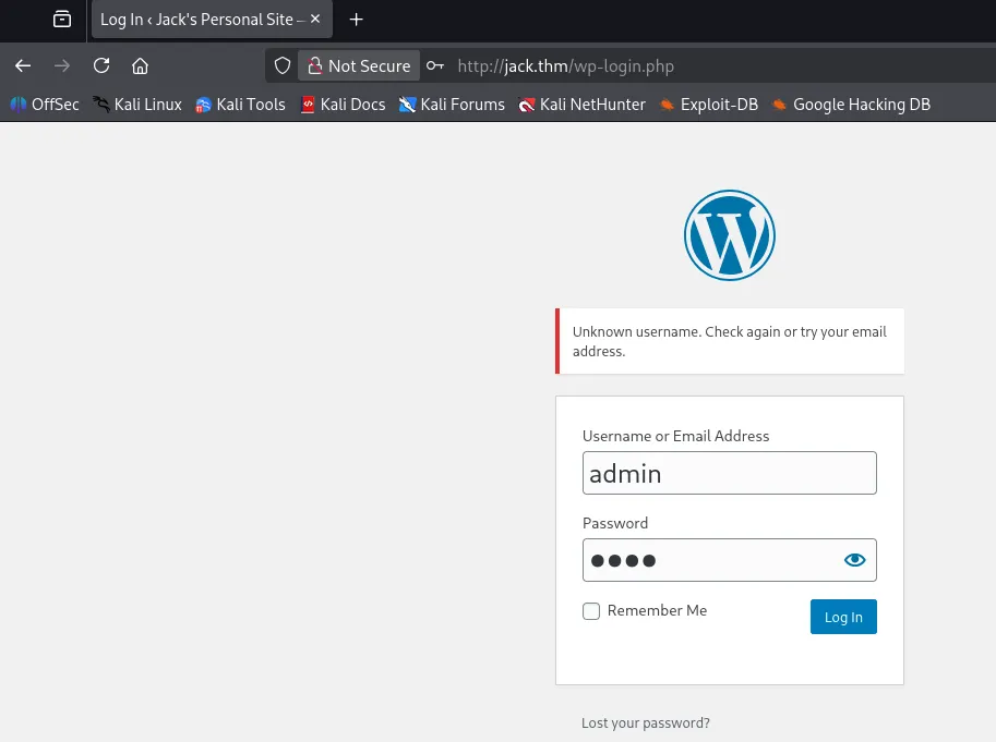 The web server is running word press and has a disallowed entry for the admin login panel. Checking the landing page, there’s not much for us here except a username of Jack and his blog post.