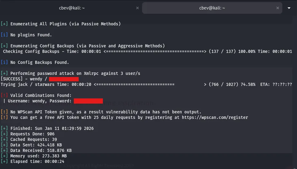 Rather than reinvent the wheel, since it’s WordPress I swap over to WPScan to find any vulnerable plugins/themes, enumerate users, etc.