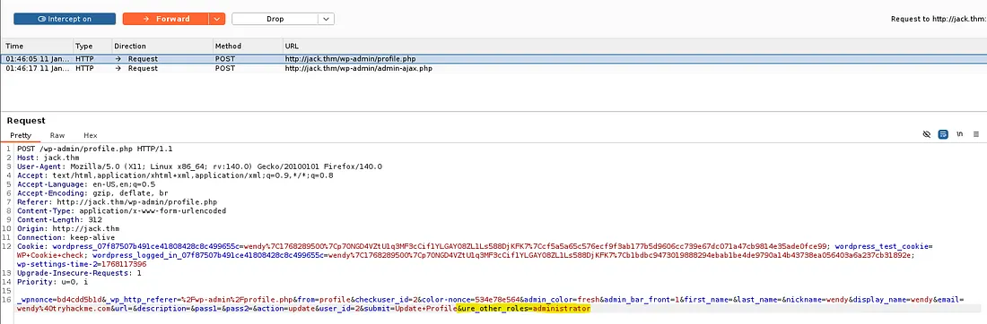 I spend some time researching vulnerabilities and I find an interesting one. We can escalate our account privileges by capturing a POST request while updating our profile and appending &ure_other_roles=administrator to the body.
