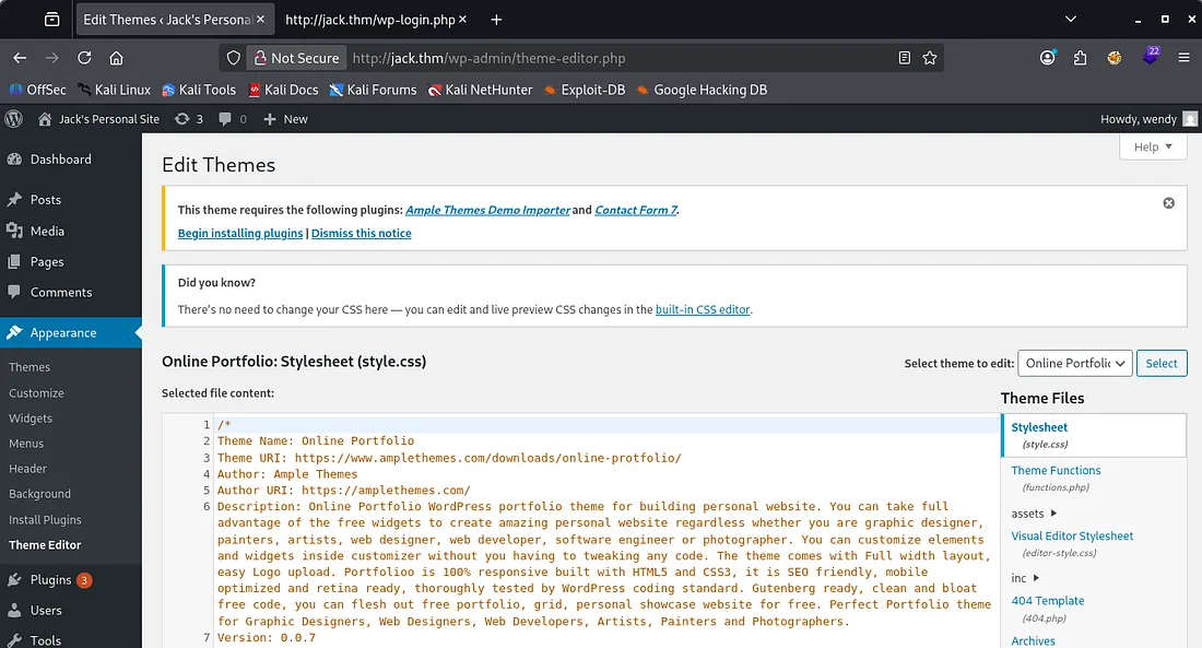 I attempt to login at the wp-admin panel using these creds and it’s a success. Looking around the dashboard we don’t have much functionality at all for now.