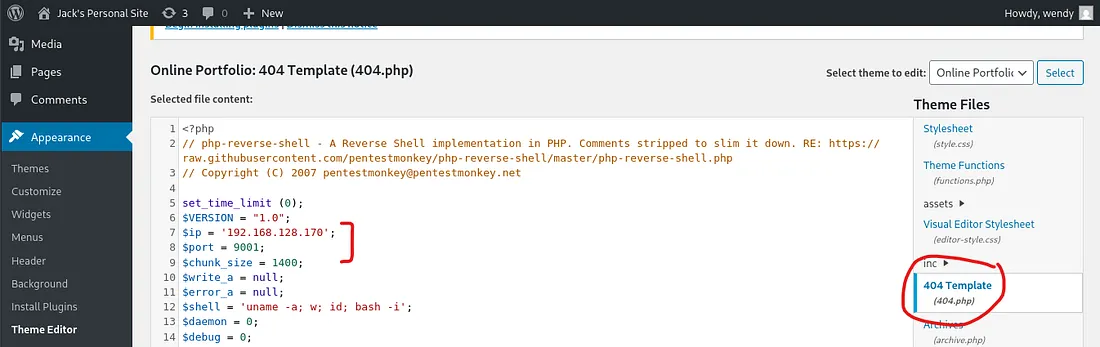 Now we have admin level privs on the site, I try the typical method of changing a theme’s 404 page script to a reverse shell pointed towards my machine.