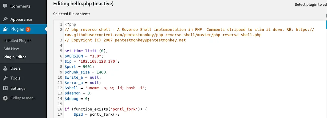 Then I check the plugins available and find that ‘Hello Dolly’ is installed. We are able to alter this plugins PHP code to our reverse shell with the same method. Here is a good article on how this works.