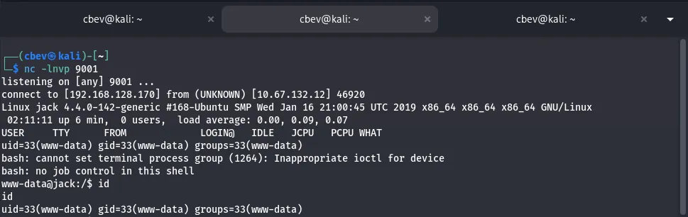 After setting up a listener of our choosing, we can navigate to http://jack.thm/wp-content/plugins/hello.php to force the site to run it.