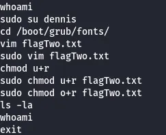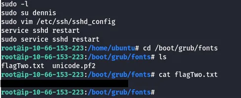 After that was taken care of, I search for the second flag again, only for it to return nothing. I check all users .bash_historyas that seemed likely and found that ‘ubuntu’ edited a file under /boot/grub/fonts.
