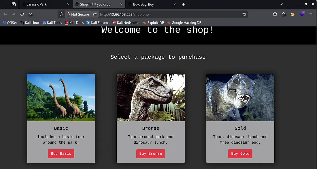 The shop is pretty generic, however navigating to each of the ‘packages’ shows that they’re reflected as an ID in the URL