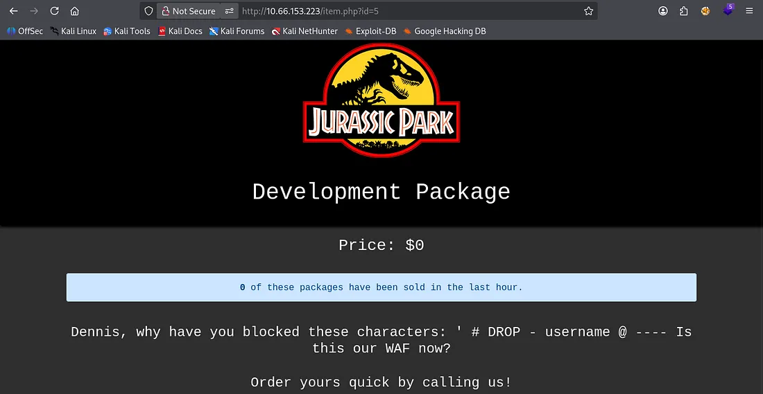 I get a hit at ?id=5 which shows a development package. There’s a message to Dennis asking why he’s blocked certain characters pertaining to SQL.