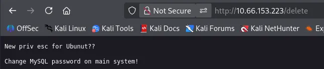 Checking my directory bust scans discloses an endpoint at /delete, looking to be a reminder for the dev to change the MySQL password.