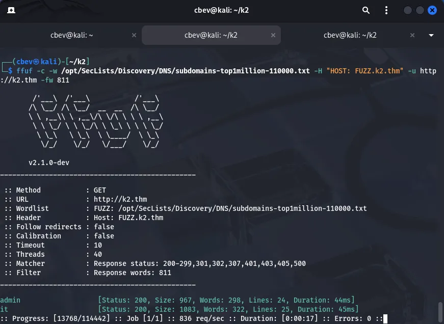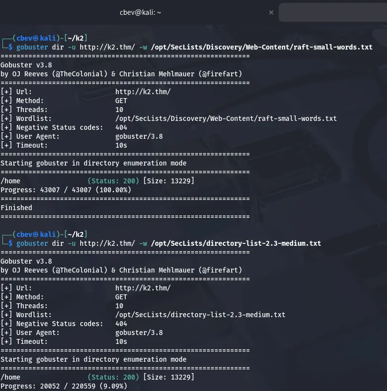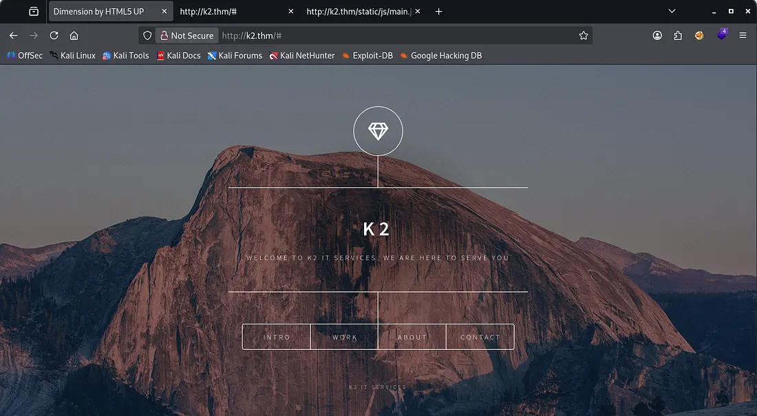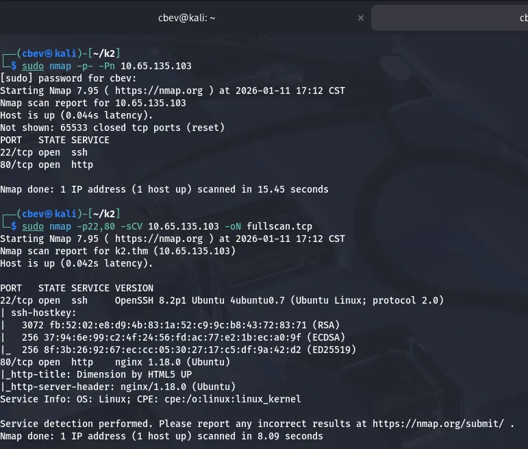 First things first, I start an Nmap scan to find running services on the given IP. I also add k2.thm to my /etc/hosts file as that is what was provided in the engagement.