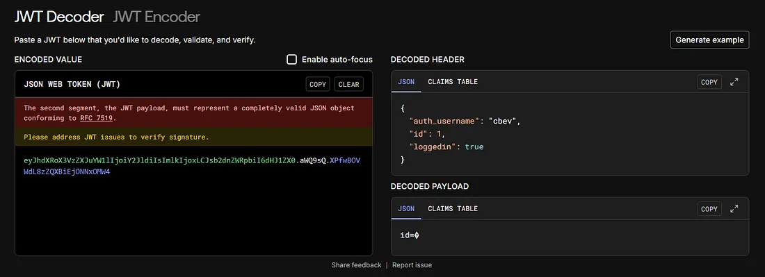 This session cookie looks like Flask and not a standard JWT. I use jwt.io to analyze this and find that we supply auth_username, id, and loggedin parameters.