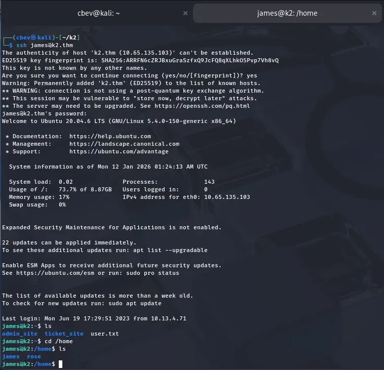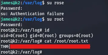 Using that to login as Rose actually doesn’t work which piqued my interest. I tried using it for root and it succeeds. Looks like they made a mistake when signing in at admin.k2.thm and used the wrong username.