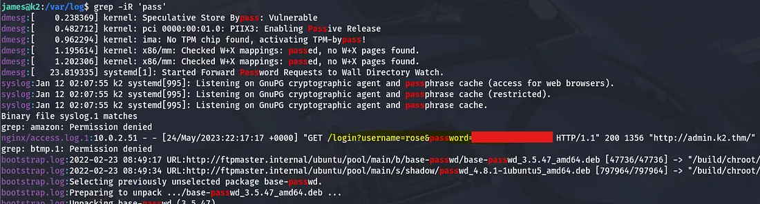 Heading back to James’ shell I find that we are in the adm group, meaning we’re allowed to read /var/log . I grep for ‘pass’ there in hopes that rose or root accidentally leaked their password and find one for rose.