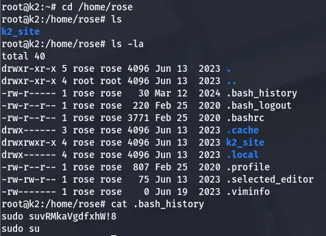 We can find the full names of users on the box inside /etc/passwd . Since we still don’t have Rose’s password, I check her .bash_history file and find that she made a type when switching users to root.
